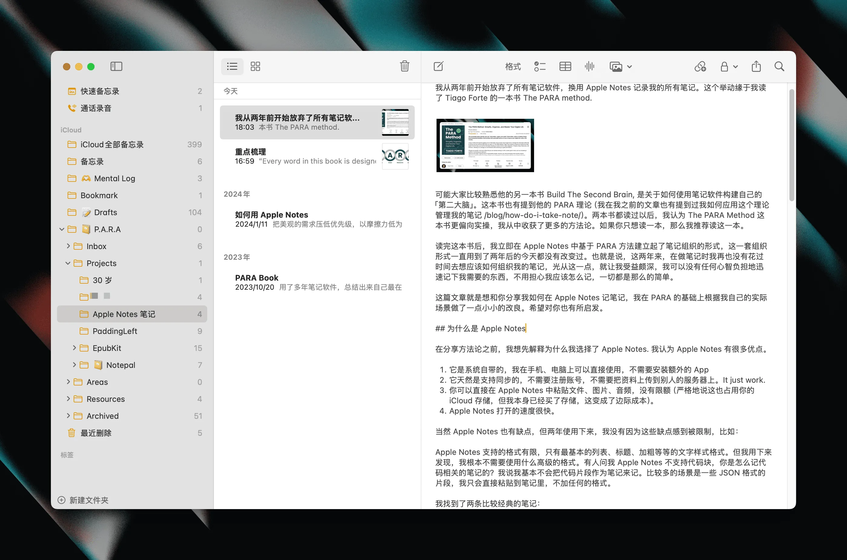 我从两年前开始放弃了所有笔记软件,换用 Apple Notes 记录我的所有笔记。这个举动缘于我读了 Tiago Forte 的一本书 The PARA method.