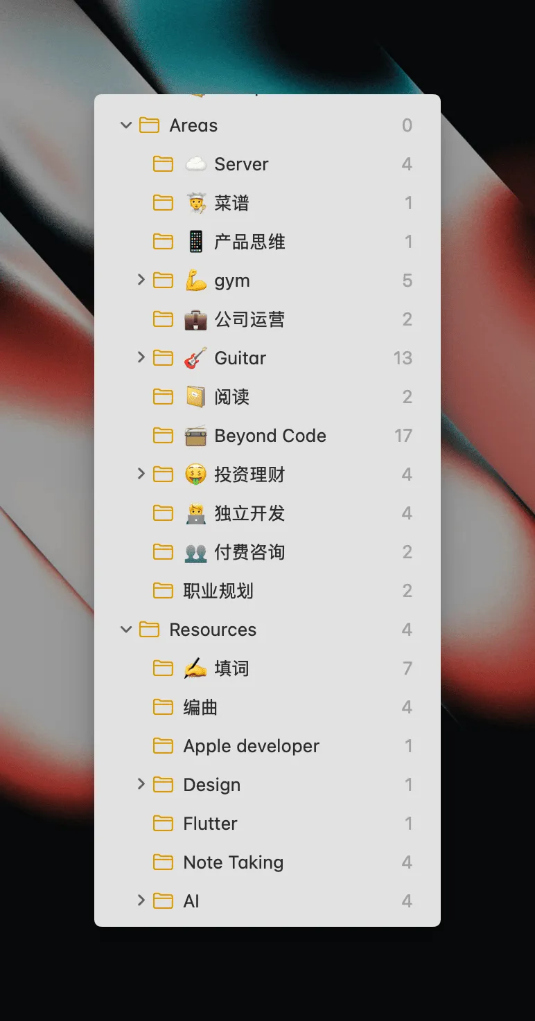 我自己的 Areas 和 Resources 其实很少碰,基本只在 Projects 和 Archive 中活跃: