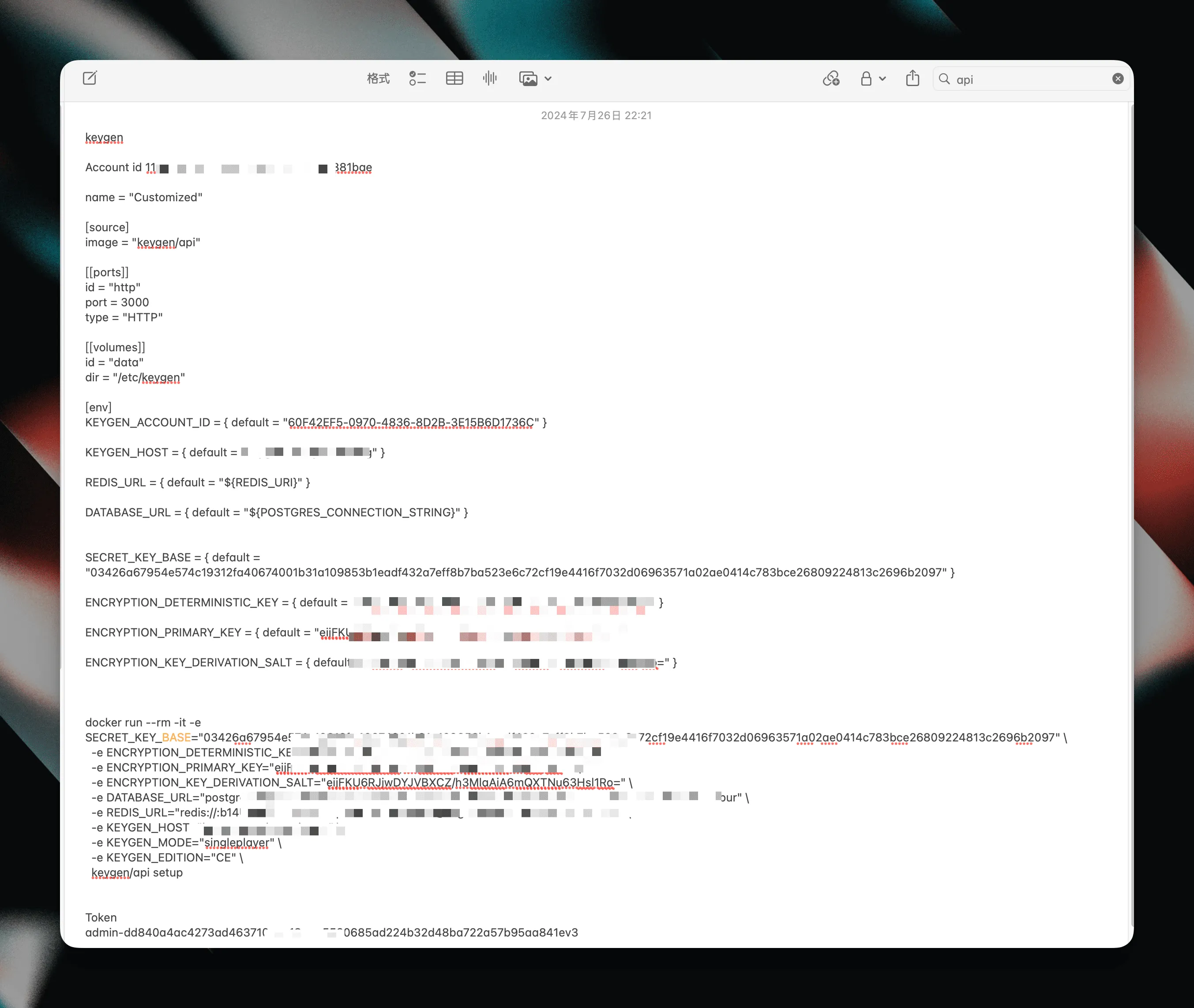 可以看到,里面不仅有 JSON, 还有 toml, 还有命令行。甚至还会有 spell check 的红线让它显示得很丑。但是我一点也不在意。因为它们是拿来用的,不是拿来看的,我不在乎它好不好看,只要我需要用到的时候能找到拿来用就好了。