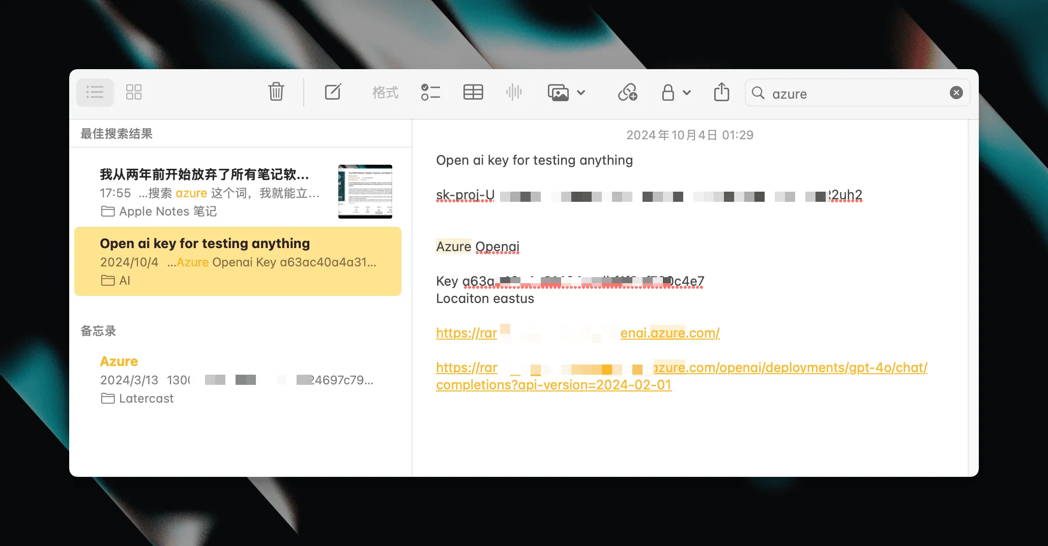 善用搜索。虽然只是关键字查询,但按照我的经验来看,这就足够了。比如我在 Apple Notes 记过我常用的 API key, 我只要搜索 azure 这个词,我就能立刻找到,我甚至都不知道它被我放在哪里了:
