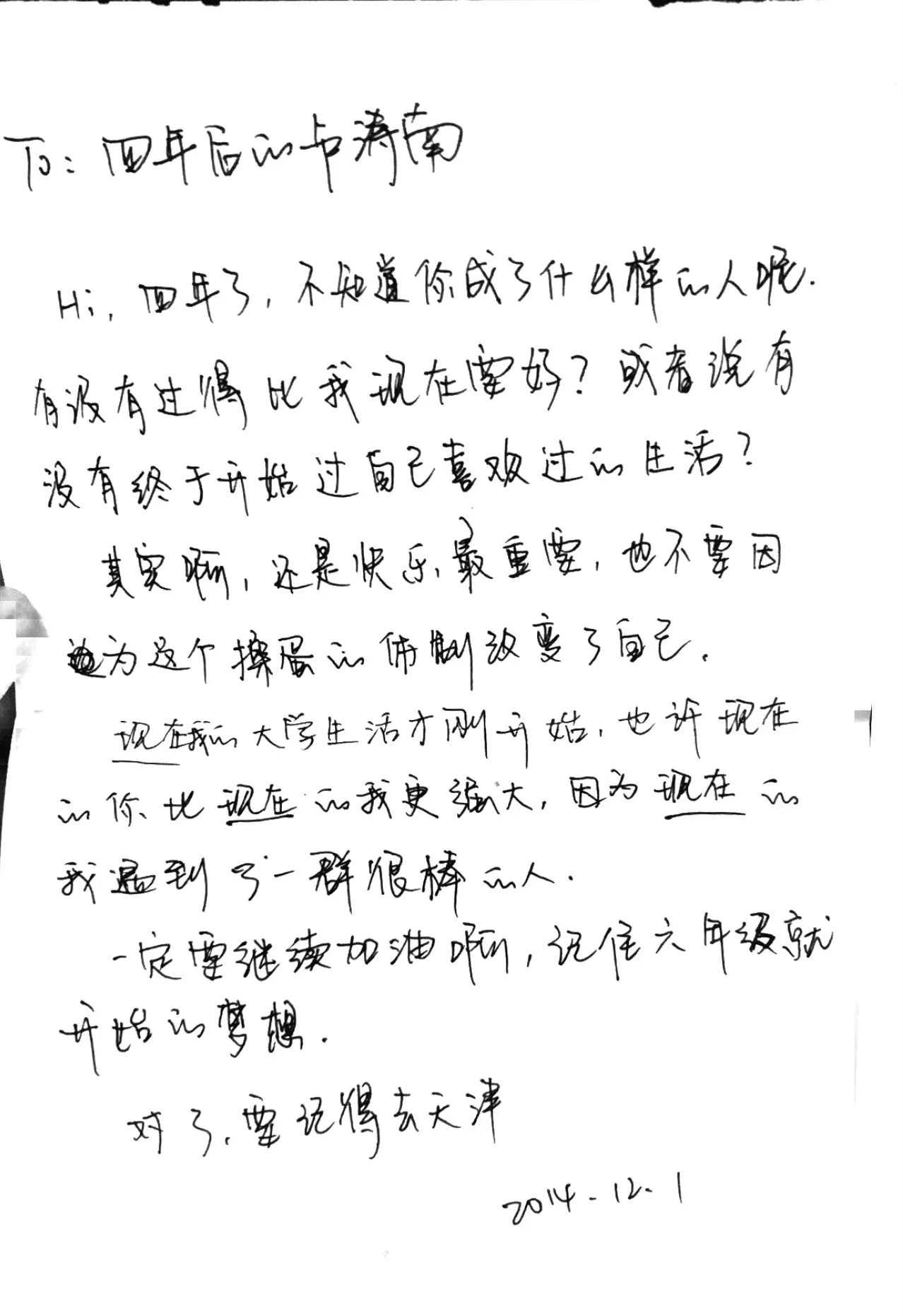 这是一封 2014 年我写给未来的自己的信。当时在上大一,是上职业规划课时老师布置给我们的一个作业,写完我们就交给老师保存,他会在我们大学毕业后返还。