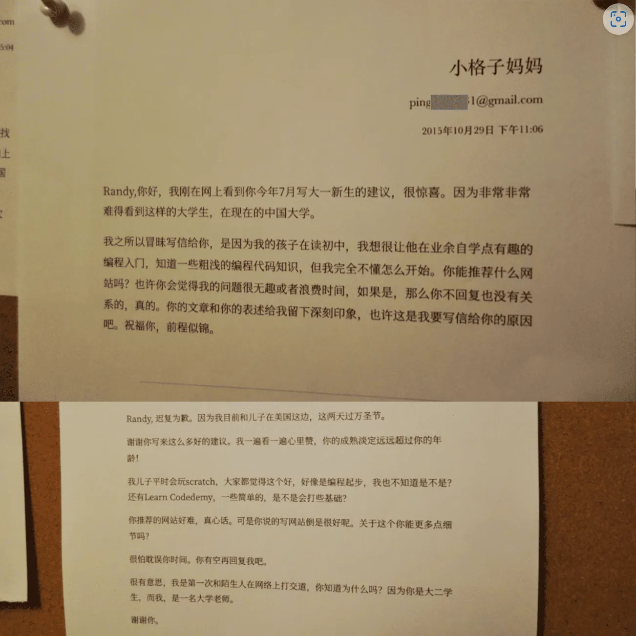 这是一位在国外当老师的妈妈,特意来信想为她的儿子寻问关于编程的问题。当时我回信尽可能地写了很多浅薄的意见和经验分享,后来就再没有通信。这位母亲让我感动。
