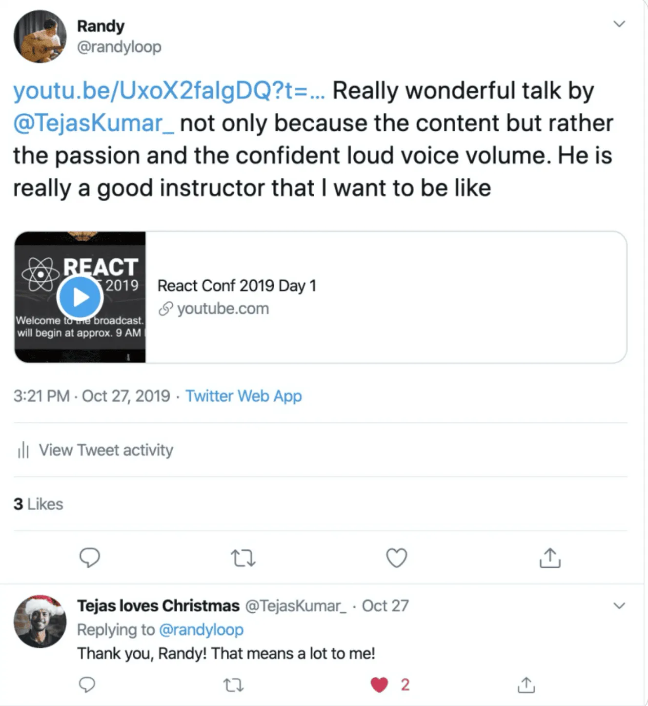 有一次我在看 React Conf, 很喜欢其中一位讲师,在 Twitter 上提到了他,他说「That means a lot to me」, 我意识到,不能吝啬表达自己的感激。